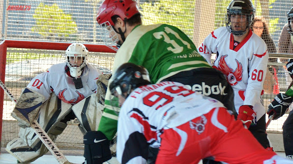 Buen partido de hockey y uno de los más emocionantes que hemos vivido esta temporada, en el que por fín logramos imponernos al equipo de Las Rozas. Los Fénix, con bastantes bajas, estuvieron muy concentrados en su juego y fueron muy bien dirigidos desde la banda por Alex, que fue ajustando a la perfección la configuración del equipo a las circunstancias del partido. Una vez más Miguel estuvo enorme, jugándose el tipo en más de una ocasión. Tanto fue así que literalmente perdió el casco en una jugada tras una fuerte entrada de un jugador de Las Rozas.